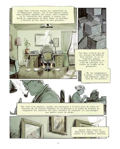 La couverture, montrant de dos un écrivain en plein travail près de sa fenêtre devient à elle seule une parabole lorsqu’on aperçoit les traces de sang frais projetées sur le parquet.
