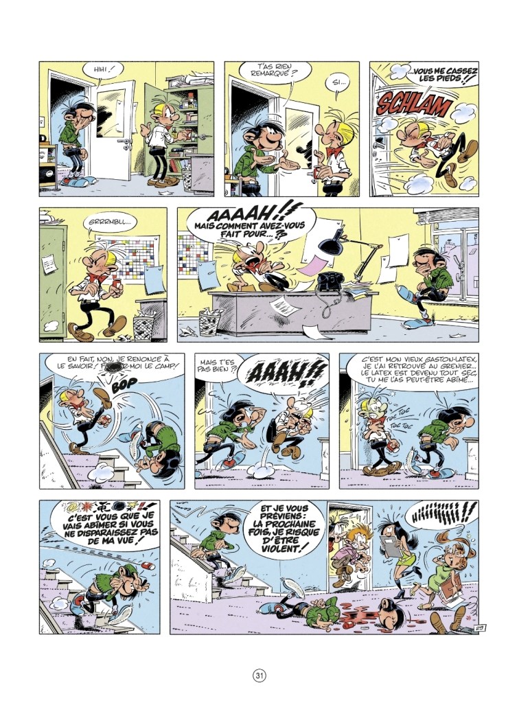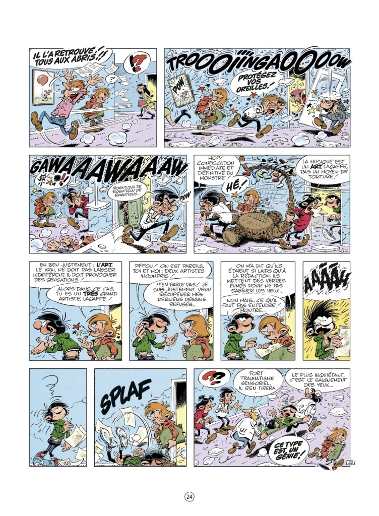 Ah, je ne vous ai pas parlé de la réapparition des objets cultes comme le Gaffophone, le Gaston latex, la boite du petit chimiste, la boule de bowling ? Qu’à cela ne tienne, vous les redécouvrirez en lisant l’album.