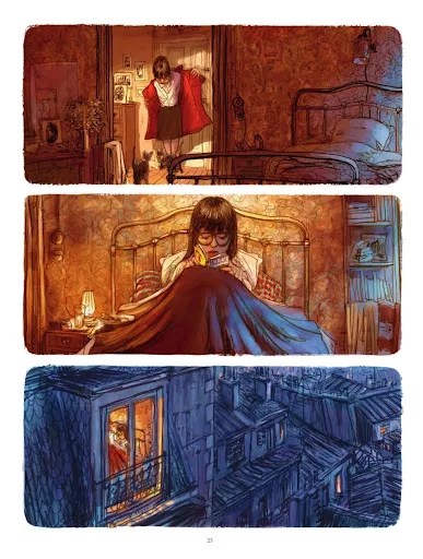 Malgré ce couac de mon fait, j’ai reconnu la patte de l’auteur dès le début : son style graphique aux dessins élégants, foisonnants et esquissés avec des couleurs tantôt contrastées, tantôt monochromes à l’exception du rouge cramoisi qui ressort comme un élément clé du récit.